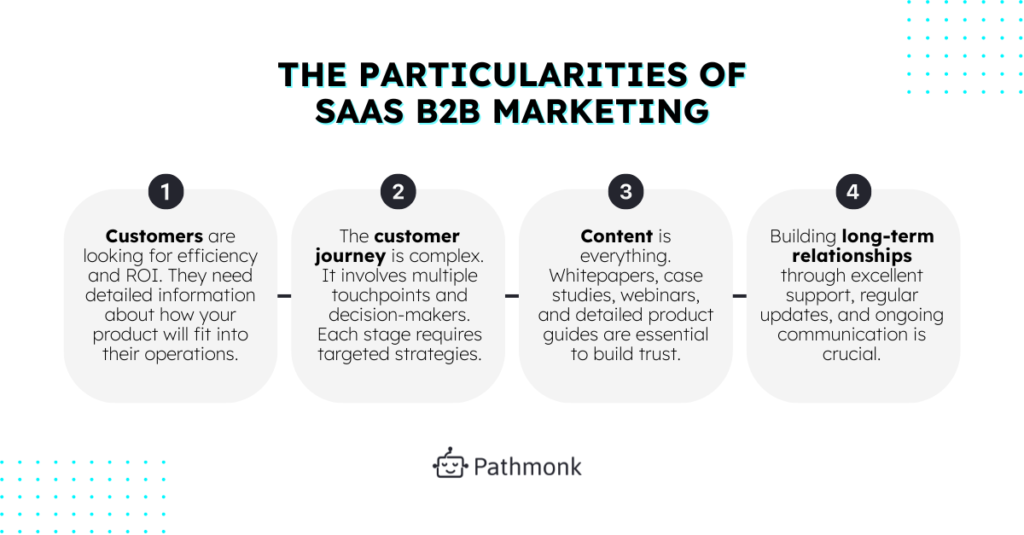 - Content is king: in the SaaS B2B world, content is everything. Whitepapers, case studies, webinars, and detailed product guides are essential to educate potential customers and build trust. Educational content helps potential customers understand the value of your product and how it can solve their problems. Providing valuable content not only helps in attracting leads but also in nurturing them through the sales funnel.